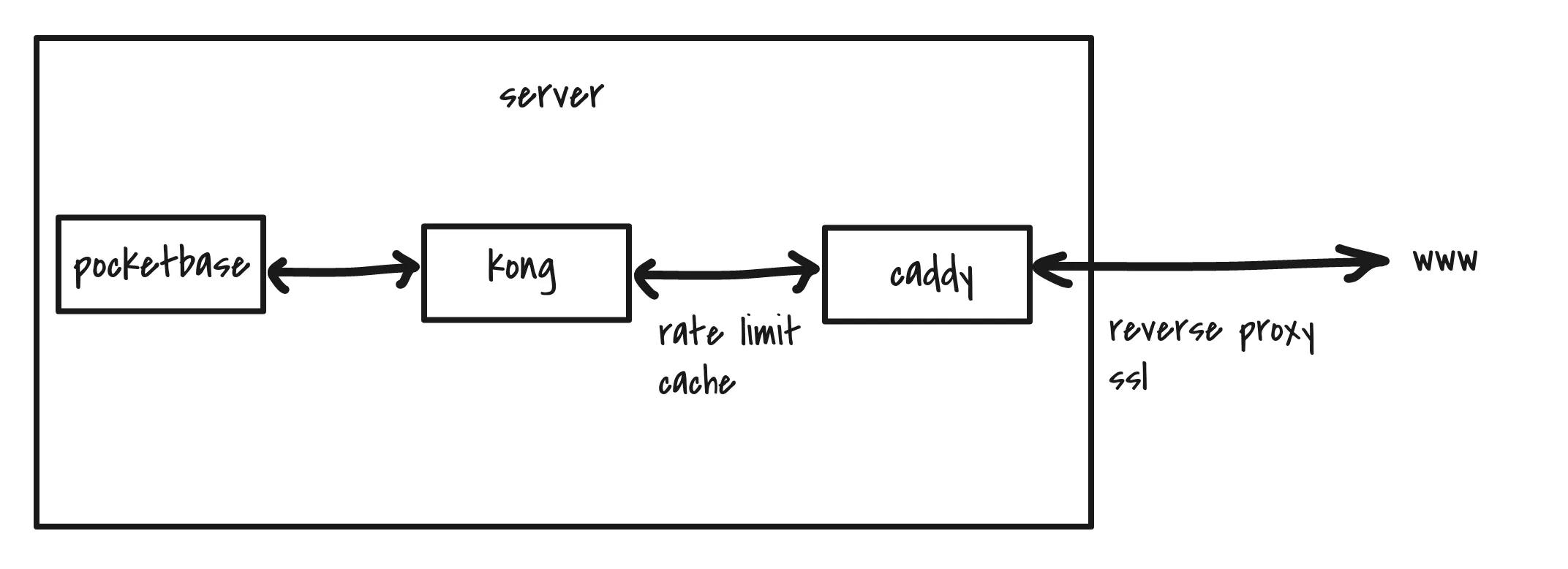 After not having to code a backend, I decided to add an API management solution called Kong3. I wanted the following features: rate limiting and caching. It was mandatory for me. If my app is going into the wild, I want it to be prepared for that. I designed the following architecture: