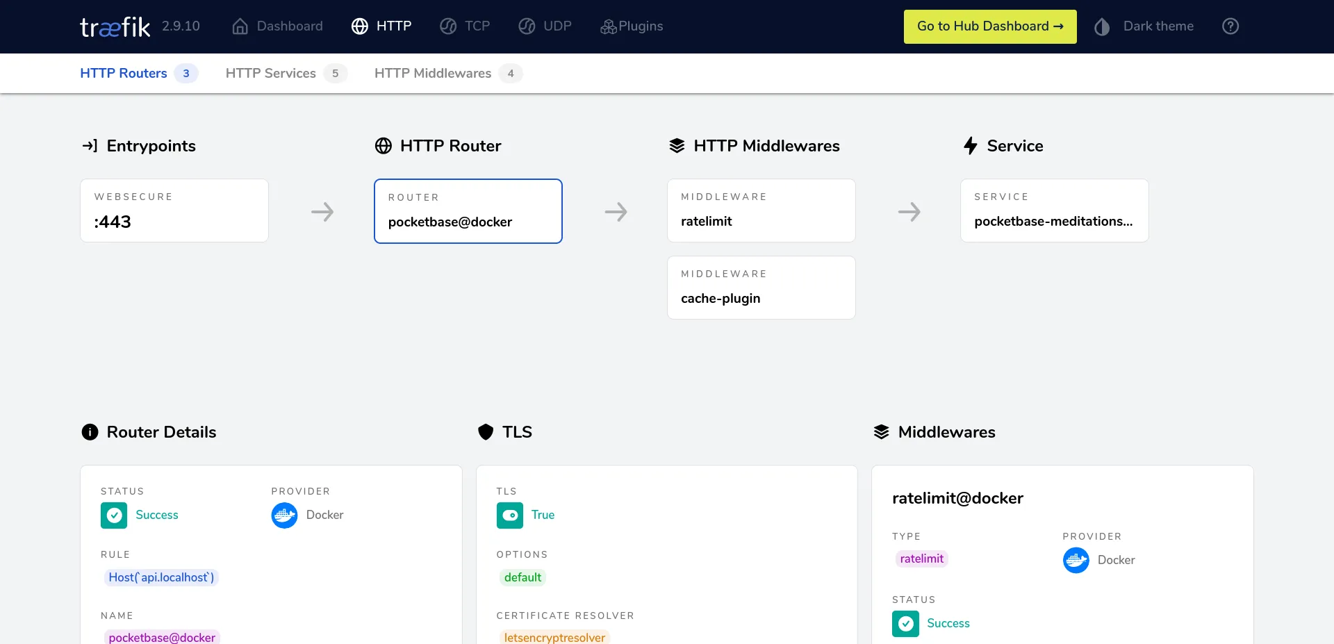 The backend will be connected to Kong and the latter will be reverse-proxied by Caddy (precisely caddy-gen4, a great Docker image that automate caddy for Docker containers). Then, I started playing with the Kong Docker image. First disappointment: it needs Postgres or Cassandra (a column-oriented database) to run. Quickly got over it after digging into the docs and discovered the db-less mode. After spending many hours tweaking my docker-compose.yml, I found successively that the Kong Manager (their GUI admin dashboard) and rate limiting plugin wasn’t available for the open sourced version. Just at this time, I wondered why I’m not using Traefik5 (Traefik is reverse proxy with automatic HTTPS like Caddy). Back in the day, I struggled to configure Traefik, this is why I switched to Caddy and was using it everywhere. But, I got Traefik to work not so long ago, therefor I checked it out, and it had all the Kong features I wanted, plus a very nice dashboard 😉.